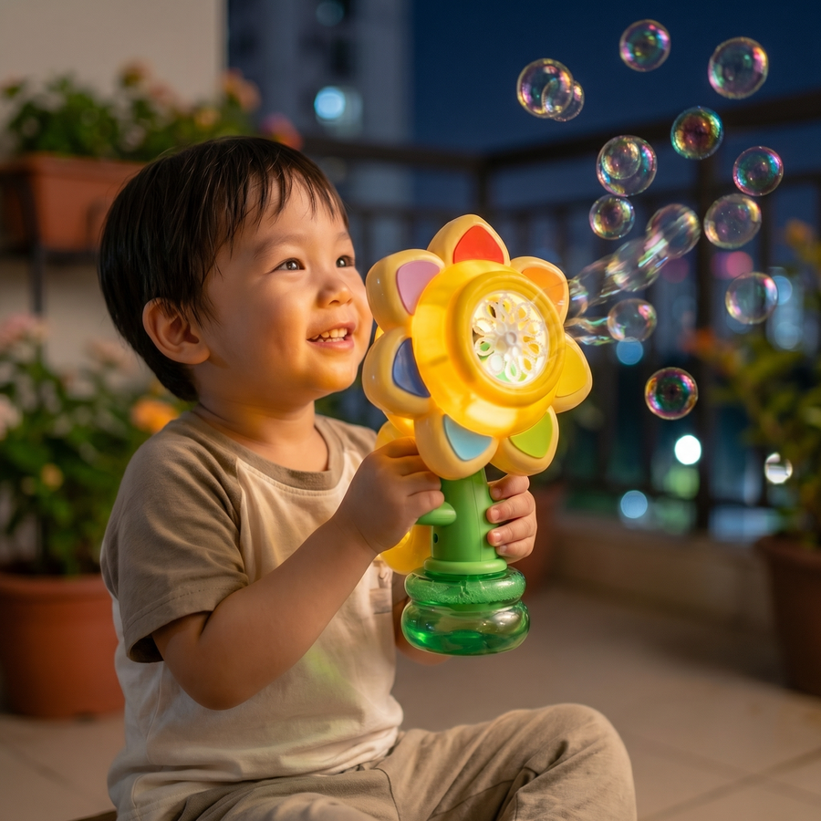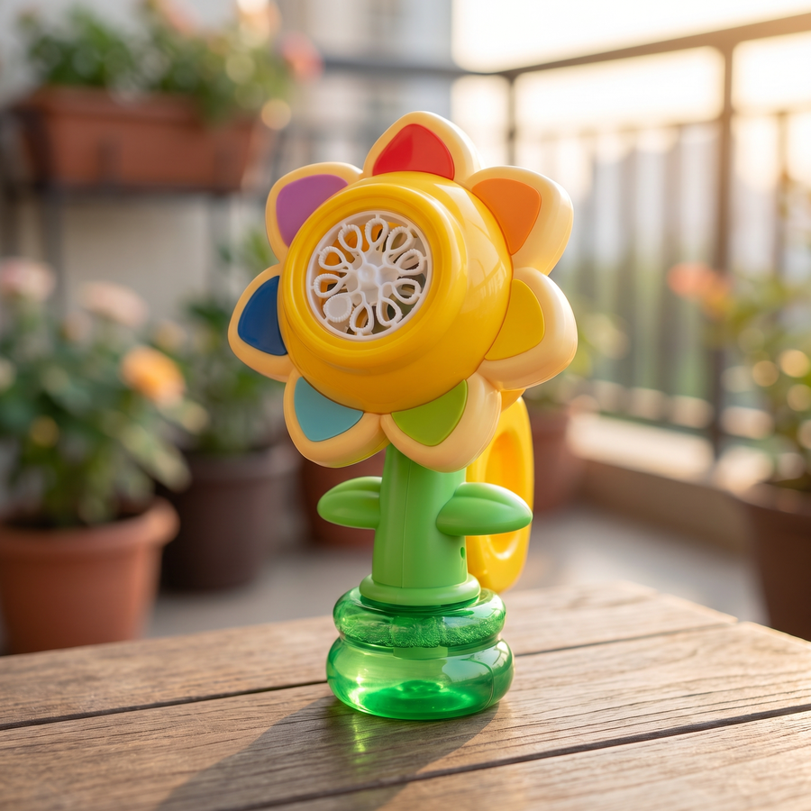 لعبة تفاعلية للأطفال بتصميم زهرة ملونة، مصممة لإنتاج تدفق مستمر من فقاعات الصابون بشكل آلي. تتميز بوجود إضاءة داخلية تجعل تجربة اللعب أكثر تفاعلاً، خاصة في الأوقات المسائية، مع تصميم مدمج يسهل على الطفل حمله والتحكم به.