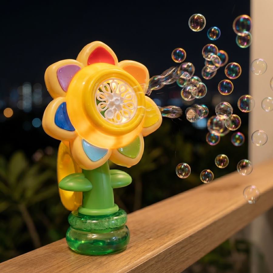 الشكل الخارجي: زهرة (دوار الشمس) بأوراق ملونة وقاعدة خضراء. الوظائف المدمجة: إطلاق آلي للفقاعات + إضاءة ليلية. أماكن الاستخدام: مناسبة للاستخدام الداخلي (الشرفات) والخارجي (الحدائق).